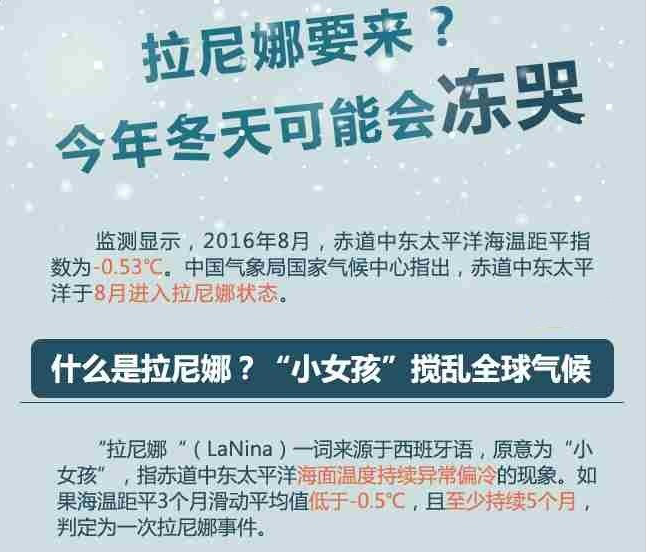 原來,目前赤道中東太平洋已進入拉尼娜狀態(tài),并可能發(fā)展成一次拉尼娜事件,和厄爾尼諾一樣,這個小女孩會攪亂全球氣候,但影響卻與厄爾尼諾相反,容易造成我國冬季氣候偏冷,容易出現(xiàn)冷冬。